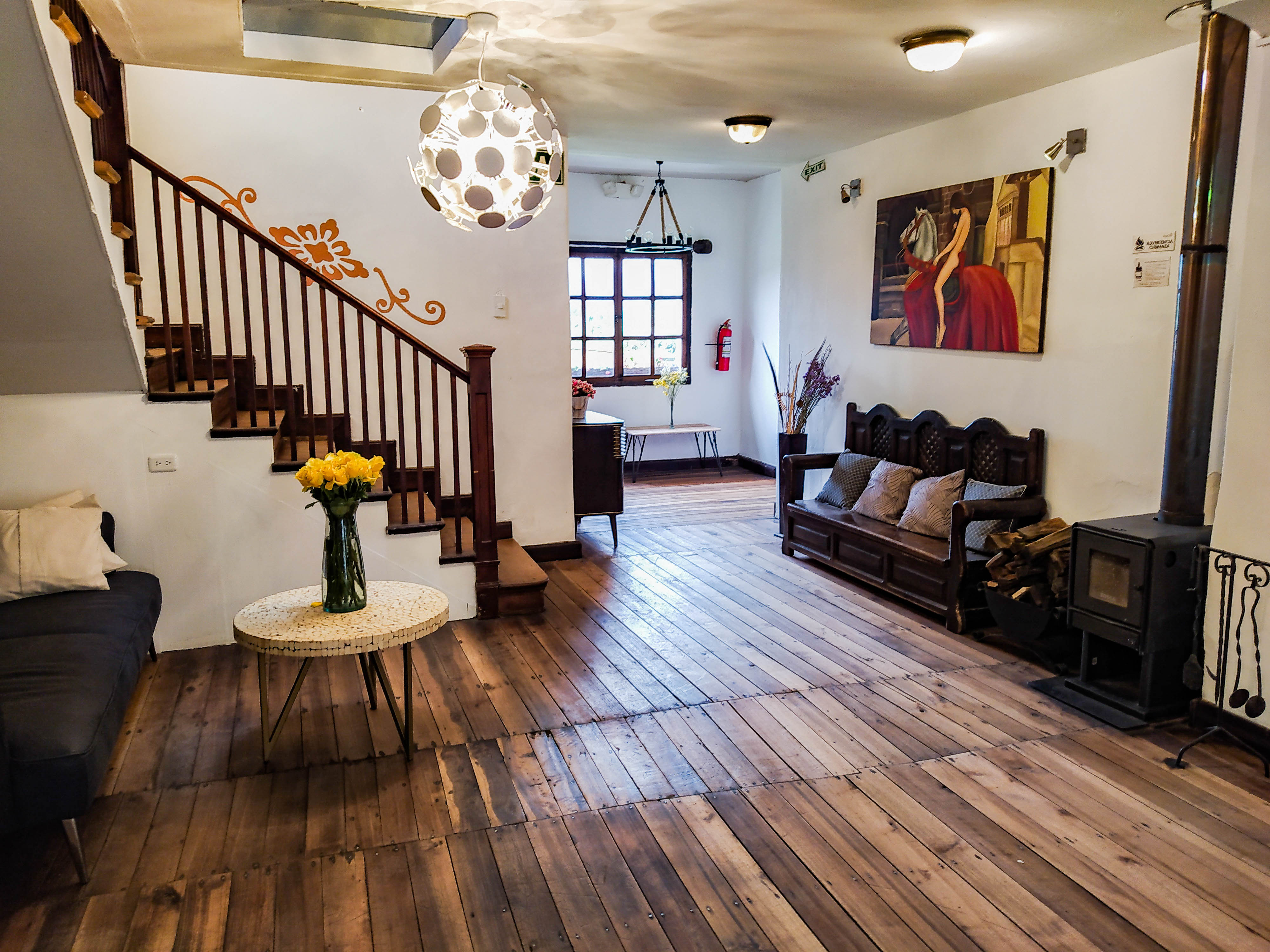The Hosteria has a warmed outdoor Jacuzzi, a Sauna and a gym. You can enjoy your time with Lamas, ducks, dogs, horses, bunnies, goats and guinea pigs. The hacienda has a big proprietary to take walks around and a big playground for kids. The hacienda also features a yoga and fitness room. There are many cozy sittings to fully enjoy the beautiful surroundings.