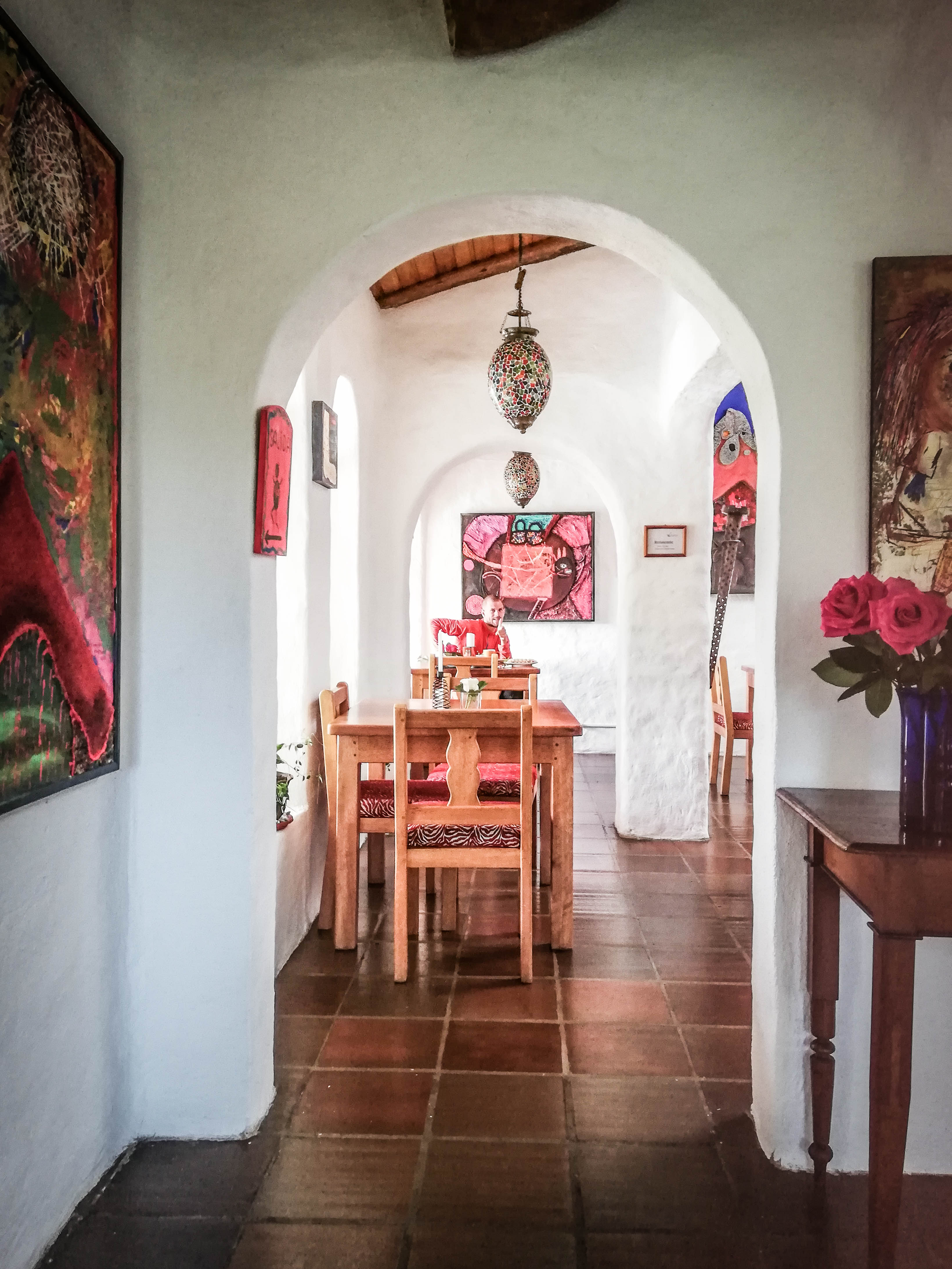 The entire common area including the dining room as well as the launch, the bar, and even the gardens, are filled with art: paintings, collages, and ad sculptures. All that, together with fresh flowers, wooden furniture, and big windows, make this place so pleasant to spend time and relax.